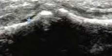 骨质中断或缺失骨表面出现弧形条状低回声,软骨表面不规则变薄、缺损形成