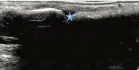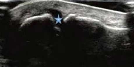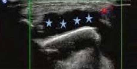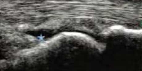 类风湿关节滑膜炎症会导致滑液渗出不断增多,形成关节腔积液。肌骨超声最少可发现1ml的积液,能对关节腔积液量及位置准确定位,通过检测判定关节腔内液性边界清楚的无回声区、细点状回声或细微的低回声条纹,判断其宽度和深度衡量积液量的多少,进而评估RA的严重程度。