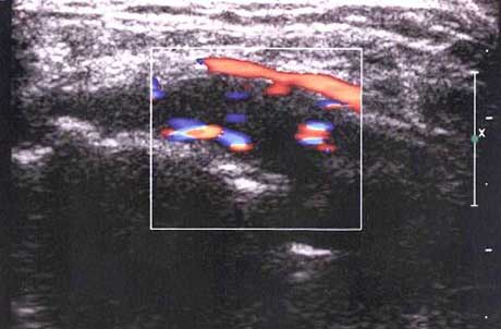 滑膜内异常血流信号:丰富的网状及树状血流信号