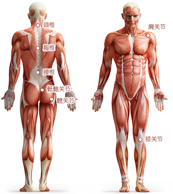 【易发部位】骶髂关节、髋关节、腰椎、胸椎、颈椎、肩关节、膝关节。